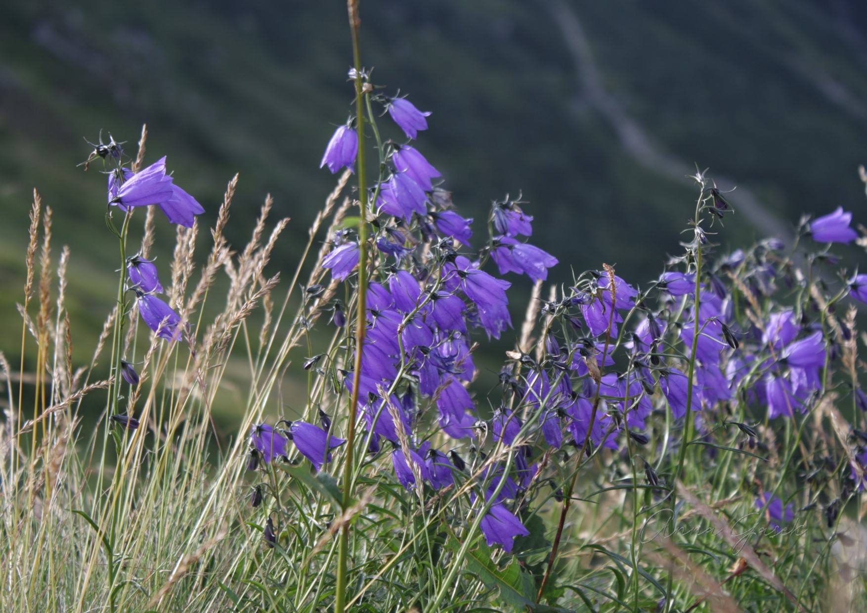 Idąc dalej, na miejscach bardziej trawiastych zobaczymy kwitnące pięknie o tej porze, dzwonki karkonoskie (Campanula bohemica subsp. bohemica) oraz ich bardzo podobnych kuzynów dzwonki okrągłolistne (Campanula rotundifolia). Różnice pomiędzy tymi dwoma gatunkami ważne są tylko dla botaników, a oba są równie czarujące. Warto jednak wiedzieć, że dzwonek karkonoski to endemit Karkonoszy czyli występuje tyko w Karkonoszach oraz na Wysokim Jesioniku w Czechach, gatunek jest objęty ochroną prawną oraz uznany za narażony na wyginięcie.