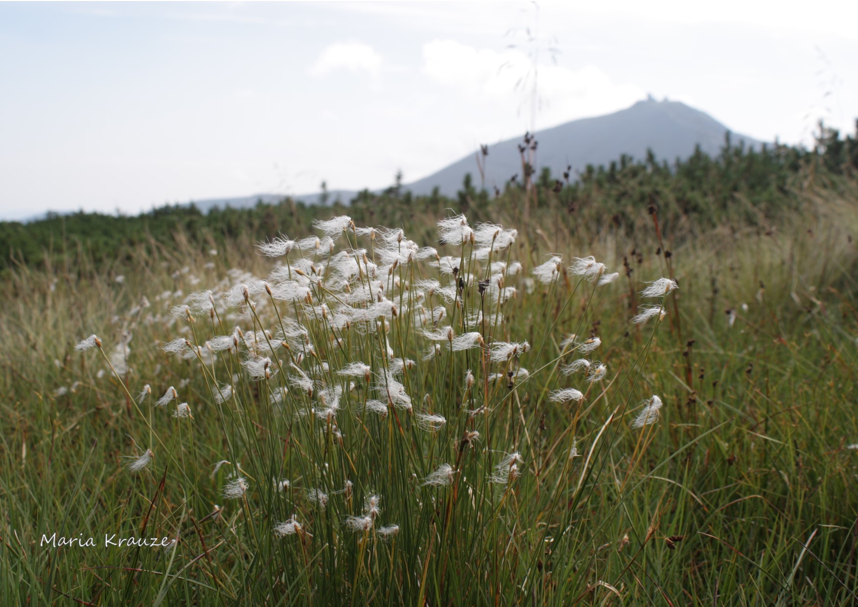 W Karkonoszach szlaki biegną również przez podmokłe łąki i torfowiska, tam w sierpniu pięknie prezentuje się wełnianeczka alpejska (Baeothyrum alpinum), ten relikt po epoce lodowcowej częściej występuje w północno-wschodniej Polsce, poza tym ma pojedyncze stanowiska na niżu oraz w Karkonoszach i Tatrach, objęty jest częściową ochroną prawną, ale również jest narażony na wyginięcie. Okwiat w postaci gładkich, wełnistych szczecinek, w czasie owocowania wydłużających się do 2,5 cm sprawia wrażenie falującego na wietrze białego woalu.
