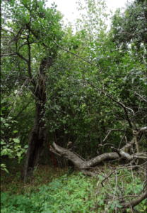 Przedzierając się przez zarośla szukaliśmy więc fundamentów wiedząc, że na pewno trafimy tam na stare drzewa. W ten właśnie sposób oznaczyliśmy kilkadziesiąt osobników jabłoni, wyróżniających się wymiarami. Niezwykle charakterystyczną cechą jaką nosiły zazwyczaj na sobie było wyraźnie miejsce szczepienia, robione w tamtym czasie wysoko (poziom metra lub więcej od korzeni). Był to dla nas dowód, że mamy do czynienia z drzewem uprawianym oryginalnie, a nie choćby ze starym i owocującym odrostem od podkładki, który usamodzielnił się po zamarciu odmiany szlachetnej.