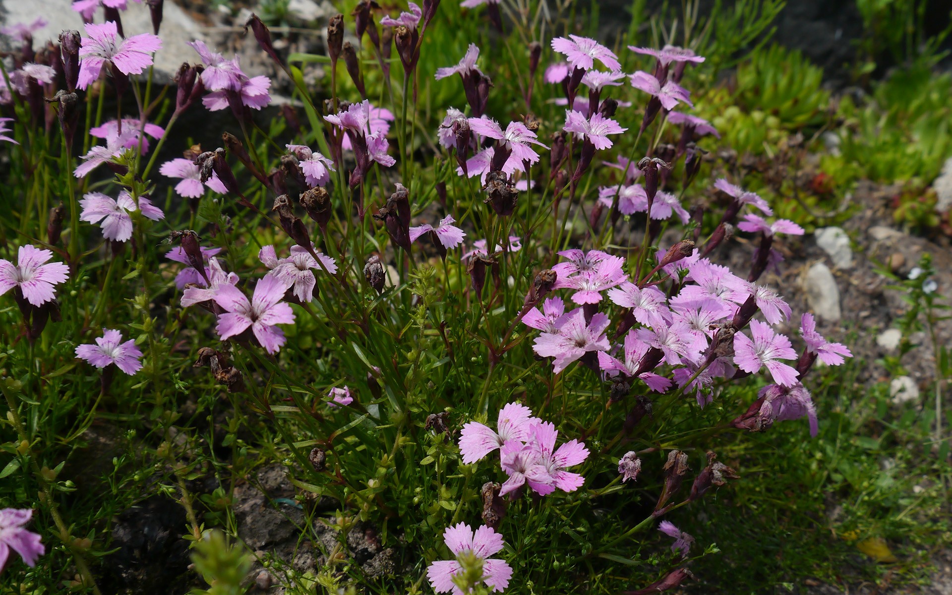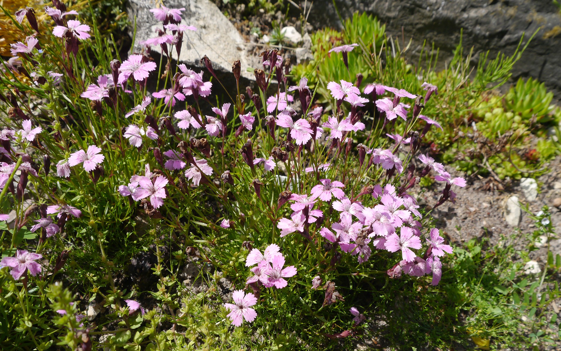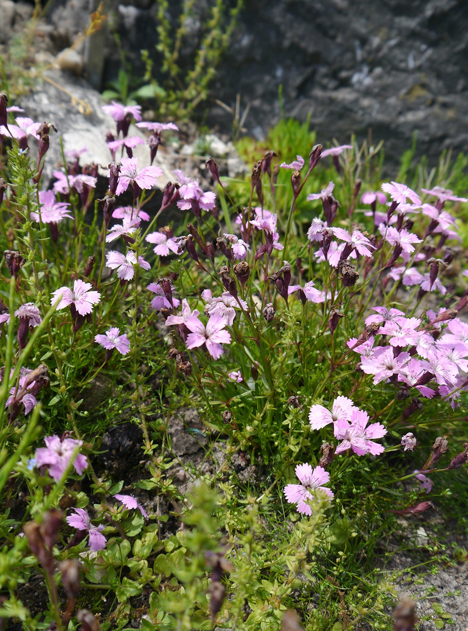 Jak poznać g. lśniącego? To dość niska (0,1-0,4 m) bylina o – jak sama nazwa wskazuje – mocno błyszczących liściach. Pędy proste, nagie, wyprostowane, takoż lśniące od wosku, chroniącego i przed mrozami, i przed upałem co na wapiennych, bezdrzewnych skałkach ma niebagatelne znaczenie. Liście różyczkowe, naprzeciwległe, u nasady łączą się w pochwę liściową. Są dość cienkie (3-5 mm szerokości), ostro zakończone, całobrzegie a równowąskie, rzadziej łopatkowato-lancetowate. Brak im przylistków. Kwiaty g. lśniącego, podobnie jak mnóstwa innych roślin górskich pozostają stosunkowo duże na tle całego osobnika – dlatego tak wysoko cenimy je w naszych przydomowych alpinariach! Wyrastają samotnie bądź parami na końcach rozgałęzień pędów generatywnych. Odznaczają się podobnie jak wiele innych przedstawicieli rodzaju Dianthus ślicznym różowym kolorem. Zapylane są głównie przez motyle. Płatki korony są orzęsione, zwężają się tworząc tzw. paznokieć. Goździk lśniący wedle literatury fachowej i bywalczyń słowackich pasm kwitnie od lipca do sierpnia. Globalne zmiany klimatu chyba jednak przyśpieszają jego wegetację, przynajmniej u nas w Powsinie. Jak pozostałe goździki także i lśniący zawiązuje owoce w postaci czteroząbkowych torebek, dłuższych od kielicha kwiatu. Nasiona są czarno-brązowa, płaskie, typu ortodoks, zatem doskonale przechowują się w naszym powsińskim kriobanku genów.