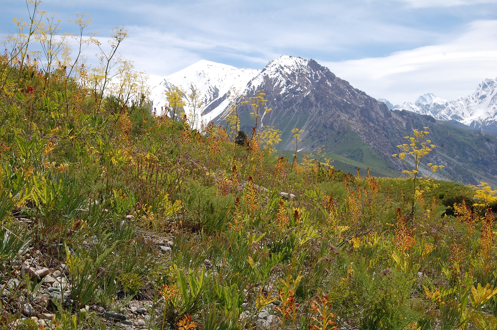 W trakcie ekspedycji w czerwcu pierwszym punktem programu była góra Chodża-Mumin (Khoja Mumin, fot. 3) koło m. Vose. Jest to druga na świecie pod względem wielkości solna góra [4]. Ma ona wysokość względną 900 m i średnicę ok. 8,5 km. Obecne w skałach tej góry żyły soli w suchym klimacie tego obszaru ulegają bardzo powolnemu wypłukiwaniu. W efekcie tego procesu powstaje kras solny (w tym głębokie jaskinie), a także siedliska dla gatunków roślin solniskowych (czyli tzw. halofitów) takich jak Aeluropus littoralis, Psillostachys leptocladai Plantago coronopus. Uczestnicy ekspedycji udokumentowali zbiorowiska występujące w tych miejscach, w tym z endemicznym dla południowo-zachodniego Pamiro-Ałaju gatunkiem – Cephalorhizum popoviiNastępnie uczestnicy ekspedycji kontynuowali zbiór danych do projektu DarkDivNet na wysokości 2500 m n.p.m. w trudno dostępnych regionach w dolinie rzeki Obikhingob. Fizjonomia roślinności ziołoroślowej zdominowana była tam przez duże byliny, takie jak Ferula kuhistanica, Prangos pabularia(jego parzące liście były zmorą dla uczestników ekspedycji – aby uniknąć przykrych konsekwencji niezbędne były rękawiczki i koszule z długim rękawem), Eremostachys lehmannianai przepięknie rdzawo kwitnące pustynniki – Eremurus fuscus(fot. 4). Dość wszechobecnym elementem tych zbiorowisk były także żółto kwitnące róże: Rosa ovczinnikovii, R. ecaei R. divina.