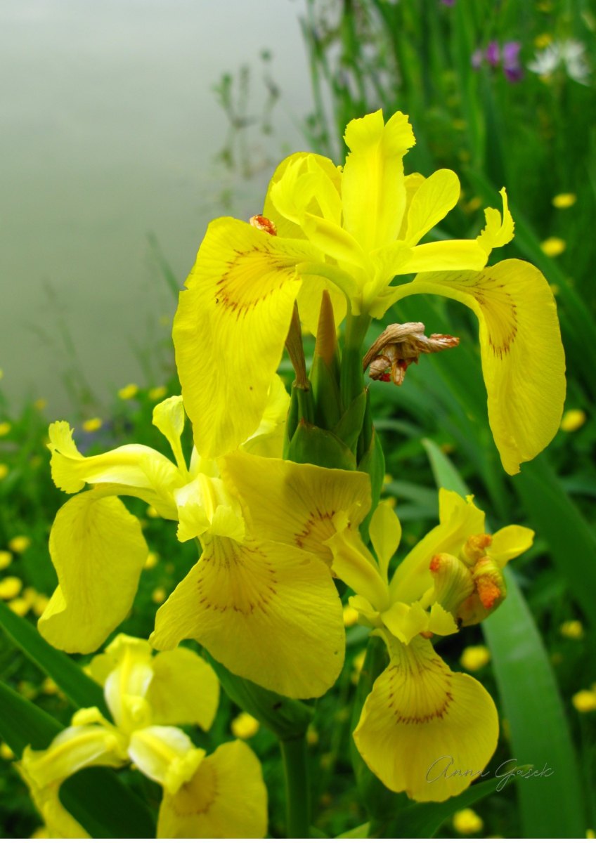 Kosaciec żółty (Iris pseudacorus) to najbardziej rozpowszechniony i pospolity gatunek kosaćca w Polsce. Rośliny tego gatunku można spotkać na całym obszarze kraju, nad brzegami wód, na mokradłach, w podmokłych lasach, gdzie potrafią tworzyć luźne wielotysięczne zgrupowania. Rośliny dorastają do 1 m wysokości. Kwiaty są żółte, na długich szypułkach, wyrastają po 1-5 z kątów podobnych do innych liści przysadek. Zewnętrzne działki okwiatu są ciemnożółte z ciemniejszą nerwacją, działki wewnętrzne są jednolicie żółte, podobnie jak znamię słupka. Kwitnienie roślin przypada na koniec maja i początek czerwca.