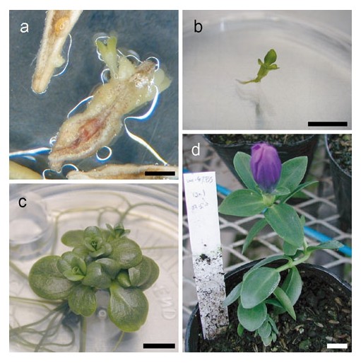 1. Androgeneza u goryczki (Gentiana triflora): zarodek androgeniczny regenerujący z pylnika po 2 miesiącach kultury (a); konwersja zarodka w roślinę (b); roślina otrzymana z zarodka po 5 miesiącach kultury (c); androgeniczna roślina przesadzona do doniczki (d)