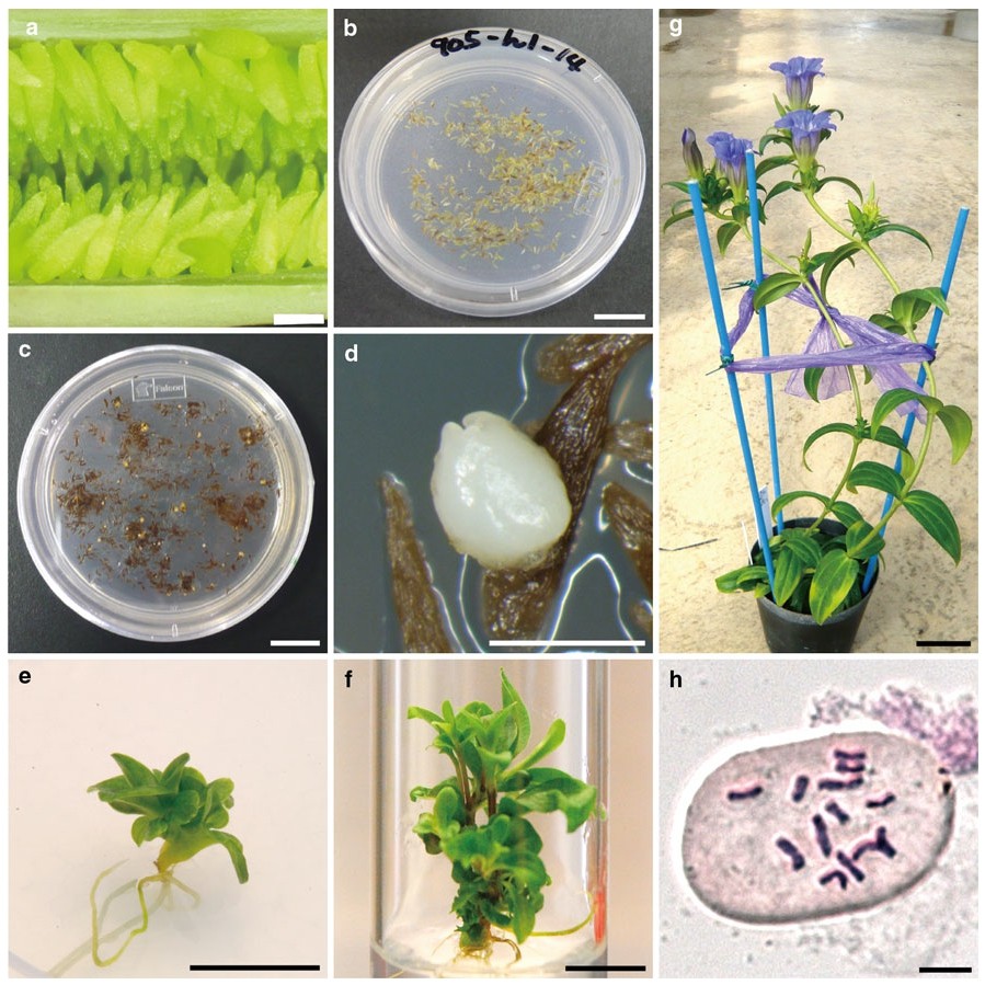 2. Gynogeneza u goryczki (Gentiana triflora): niezapłodnione zalążki wewnątrz zalążni (a); zalążki wyłożone na pożywce (b); zarodki gynogeniczne regenerujące z zalążków (c-d); roślina otrzymana z zarodków gynogenicznych (e-f); gynogeniczna roślina w doniczce (g); 13 chromosomów widocznych w komórce haploidalnej rośliny, podczas gdy typowa dla tego gatunku liczba chromosomów wynosi 26 (h)