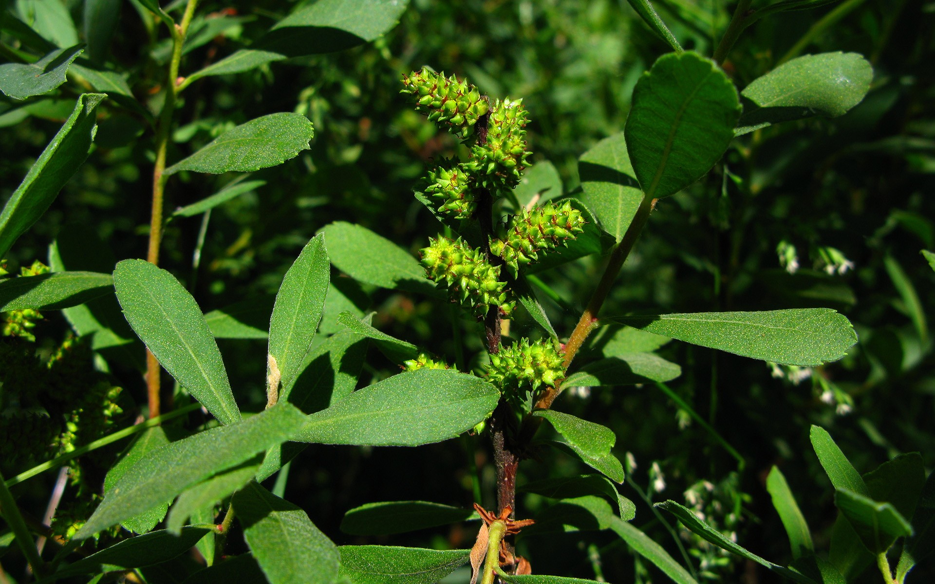 Silnie rozgałęziony krzew woskownicy.