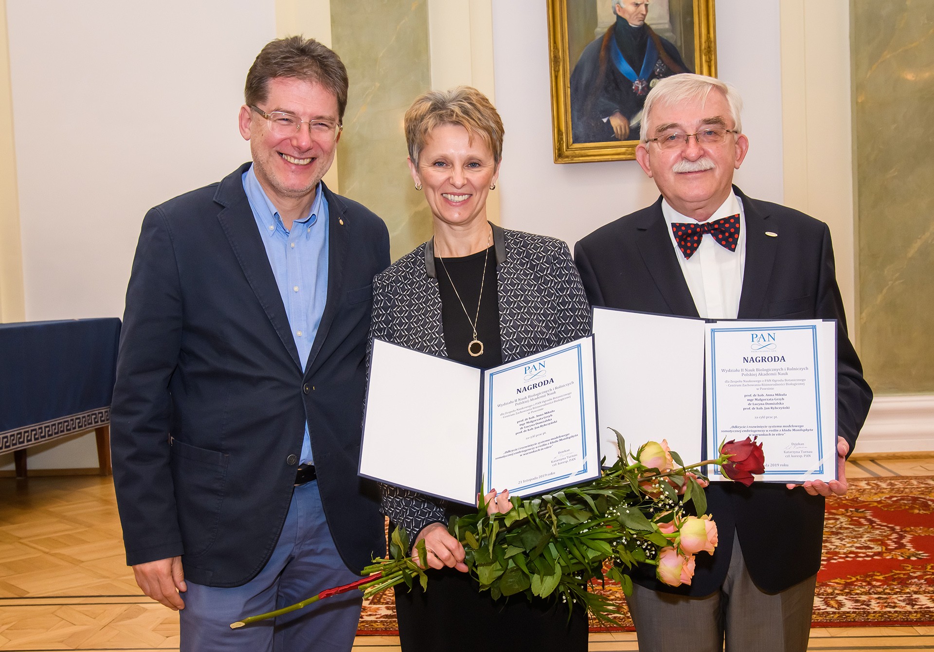 Dnia 11 grudnia 2019r. zespół kierowany przez Panią prof. dr hab. Annę Mikułę w składzie: mgr Małgorzata Grzyb, dr Lucyna Domżalska i prof. dr hab. Jan Rybczyński został uhonorowany nagrodą Wydziału II Nauk Biologicznych i Rolniczych Polskiej Akademii Nauk za wybitne osiągnięcia badawcze opisane w cyklu publikacji pod tytułem: „Odkrycie i rozwinięcie systemu modelowego somatycznej embriogenezy u roślin z kladu Monilophyta w warunkach in vitro”. Ogólnoświatowa fascynacja procesem somatycznej embriogenezy zachodzącym w kulturach in vitro trwa już ponad 60 lat. Została zapoczątkowana opisaniem przez Reinerta i zespół Stewarda w 1958 struktur marchwi przypominających swoim wyglądem i rozwojem izolowane z nasion zarodki zygotyczne. Wiele lat po tym odkryciu okazało się, że nie jest to proces ograniczony tylko do roślin dwuliściennych. W 1980 roku, Vasil i Vasil (1980) otrzymali zarodki somatyczne u Pennisetum americanum – przedstawiciela roślin jednoliściennych, a 5 lat później Hakman i von Arnold (1985) opisali zarodki u Picea abies – gatunku należącego do nagonasiennych. Najpóźniej, bo dopiero w 2000 r., udokumentowano regenerację drogą somatycznej embriogenezy u Lycopodiella inundata – widłaka będącego przedstawicielem roślin zarodnikowych (Atmane et al. 2000). Olbrzymia efektywność rozmnażania roślin drogą somatycznej embriogenezy stała się podstawą wykorzystania tego zjawiska w hodowli, selekcji i zabezpieczaniu różnorodności biologicznej wielu gatunków o znaczeniu użytkowym. Duże zainteresowanie tą drogą regeneracji sprawiło, że do 2015 r. proces somatycznej embriogenezy opisano u wielu gatunków roślin nasiennych i dwóch zarodnikowych reprezentowanych przez widłaki (Atmane et al. 2000; Szypuła et al. 2005). Luka w odkrywaniu somatycznej embriogenezy, widoczna na drzewie filogenetycznym pomiędzy roślinami nasiennymi a widłakami, została wypełniona przez Zespół Biotechnologii Konserwatorskiej PAN OB-CZRB w Powsinie. W 2015 roku Członkowie tego Zespołu po raz pierwszy na świecie opisali somatyczną embriogenezę u paproci drzewiastej Cyathea delgadii należącej do kladu Monilophyta (Mikuła et al. 2015), dowodząc tym samym, że badany proces ma charakter ogólnobiologiczny.