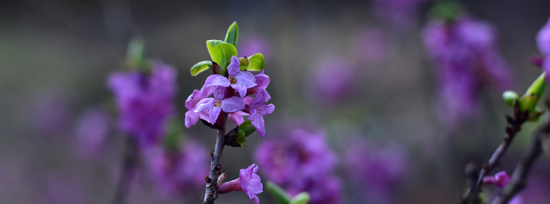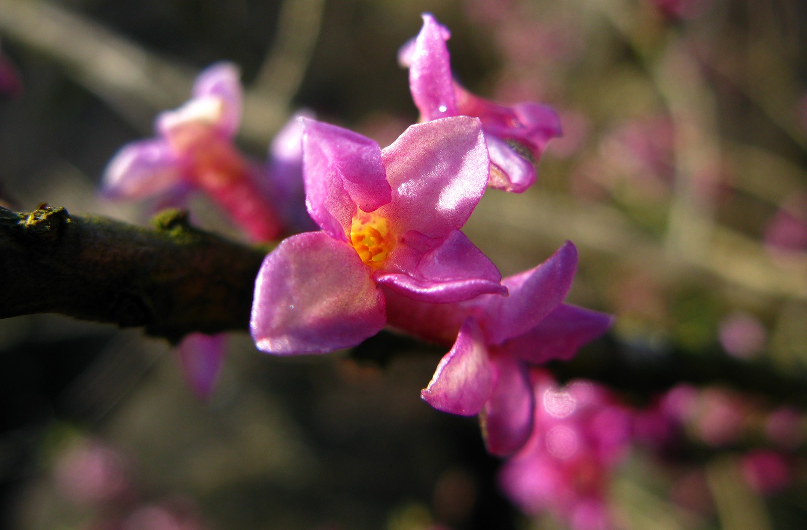 Następnym gatunkiem, który określa przedwiośnie, jest wawrzynek wilczełyko (Daphne mezereum). Ten niewielki leśny krzew nieczęsto można spotkać w naturze, ale jako roślina tak wcześnie zakwitająca pojawia się w uprawie w ogrodach. W sprzyjających warunkach wawrzynek może zakwitnąć już na początku stycznia, jego ukształtowane latem pąki tylko czekają na kilka dni z dodatnimi temperaturami. Zazwyczaj to bardzo wczesne kwitnienie jest mało obfite, tak jakby roślina „przeczuwała”, że nie należy ufać styczniowym ociepleniom. W 2018 wawrzynek wilczełyko w Ogrodzie zakwitł trzy razy, po raz pierwszy kwiaty pokazały się 15 stycznia, główne kwitnienie zanotowano 16 marca, a jeszcze 10 listopada niektóre krzewy zakwitły, bo miały wrażenie, że to już wiosna.