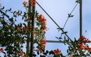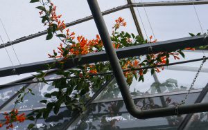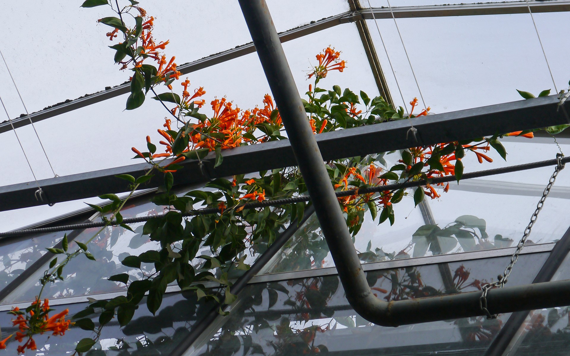 Niezwykłej urody, a wciąż niemal nieznanym w Polsce pnączem jest pyrostegia powabna Pyrostegia venusta syn. Bignonia ignea, kwitnąca właśnie w naszej Oranżerii. Pyrostegia pochodzi z Ameryki Południowej, a dokładniej z luźnych, świetlistych lasów oraz tamtejszych sawann zwanych campos cerrados na terenach południowej Brazylii, Boliwii, Paragwaju oraz północno-wschodniej Argentyny. Obecnie uprawiana jest na zewnątrz w całej strefie okołozwrotnikowej, gdzie cudownie ozdabia ściany, ogrodzenia i pergole, w domach i szklarniach zaś także u nas. Latem można wystawiać ją na tarasy i balkony, jednak już wczesną jesienią należy wstawiać ją z powrotem do ogrodu zimowego czy oranżerii. W niektórych regionach pyrostegia dziczeje. Lokalnie może konkurować z miejscową florą i łamać konary masowo obrastanych drzew, jak to się obserwuje chociażby w Serengeti. Stąd specjalny nadzór nad tym ślicznym pnączem na Hawajach, których szata roślinna składa się obecnie głównie z obcych przybyszów. Całkiem ładne są zielone liście pyrostegii, skórzaste, lśniące, jakby plastikowe albo polakierowane, wyrastające naprzeciwlegle, złożone z trzech eliptycznych listków, osiągające 8-10 cm długości. Jeden z listków przekształca się w haczykowaty, znowuż trójdzielny wąs czepny, zakończony charakterystycznymi przylgami. Liściom zawdzięcza pyrostegia wiele swoich ludowych i handlowych nazw, używanych głównie w Brazylii jak „łapka jaszczurki”, „winorośl o kocich pazurach” czy „palce smoka”.