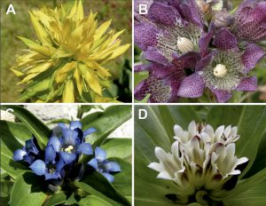 - Wybrane gatunki goryczek badane przez nasz zespół: goryczka żółta (A), panońska (B), krzyżowa (C) i tybetańska (D)