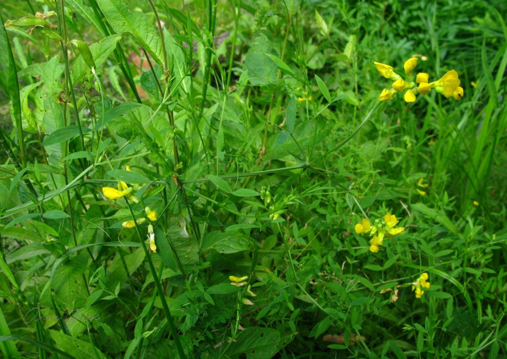 Groszek łąkowy (Lathyrus pratensis) pospolicie występuje w całej Polsce, w górach aż po piętro kosodrzewiny, rośnie na łąkach, na pastwiskach i w zaroślach. Jest byliną o płożącej lub pnącej i rozgałęzionej łodydze dorastającej od 30 cm do 1 m długości. Liście są z jedną parą podłużnie lancetowatych, ostro zakończonych listków, a osią zakończoną wąsem. Kwiatostan składa się z od 5 do 10 kwiatów o słonecznie żółtej koronie. Kwitnie długo, bo zaczyna w czerwcu i kwitnące rośliny można jeszcze zobaczyć w końcu sierpnia.
