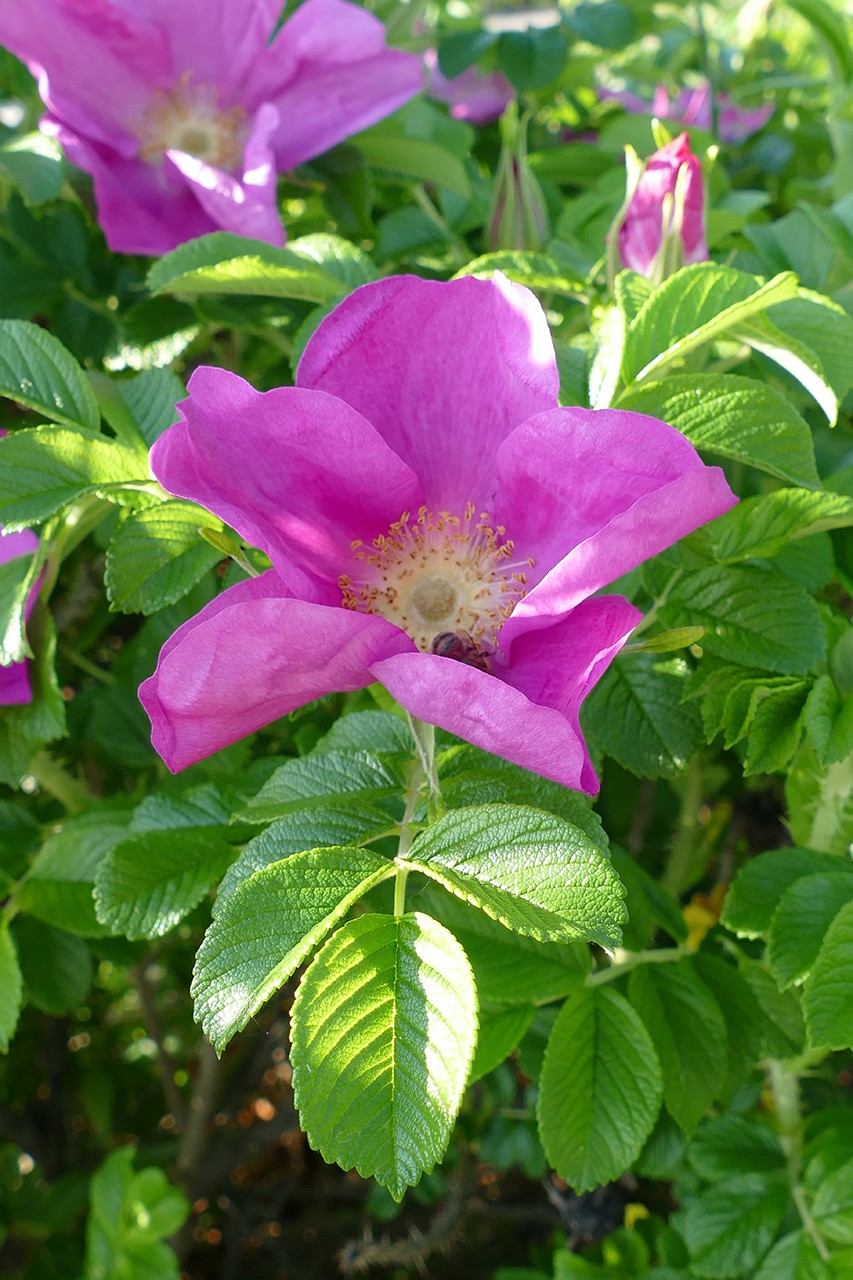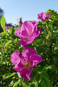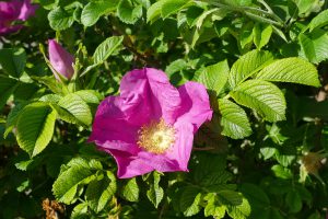 Róża pomarszczona (Rosa rugosa), zwana także różą japońską i różą fałdzistolistną, to gatunek powszechnie znany. Ma duże, mocno i słodko pachnące, amarantowolila kwiaty, pojawiające się obficie w trzeciej dekadzie maja i potem rzadziej nawet do mrozów. Kwiaty zawierają 200-250 pręcików, 100 słupków, ale nie zawierają miodników. Mimo to są chętnie odwiedzane przez owady zapylające. Spotykane są formy o kwiatach białych i różowych. Zawiązujące się pseudoowoce dojrzewają od sierpnia i są na krzewach jeszcze w zimie. Liście są pomarszczone (stąd nazwa), świeżozielone, błyszczące, ogonek i oś liścia z kolcami, jesienią przebarwiają się na żółto. Krzewy bardzo gęste, o wzniesionym pokroju i sztywnych prostych pędach, łatwo rozrastają się za pomocą odrostów. Kolce obficie pokrywają pędy. Tworzy zarośla bardzo trudne do pokonania.