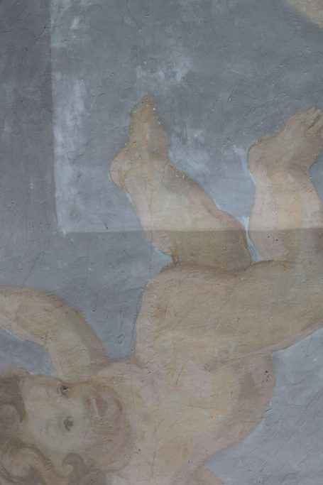 Once the supporting structure of the plafond was stabilized, it was possible to continue conservation work on the painting. Currently, conservators are cleaning the paint layer using chemical methods. Then, after the structural strengthening of the polychrome, the stage of restoring the mortar and painting layer will begin.