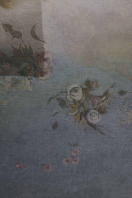 In the first phase of the work, the painting was mechanically cleaned of surface dirt. Small scales and local separations of the paint layer were glued to the substrate, then the entire surface of the plafond was protected with a special fabric for the duration of the work carried out on the supporting structure of the ceiling.