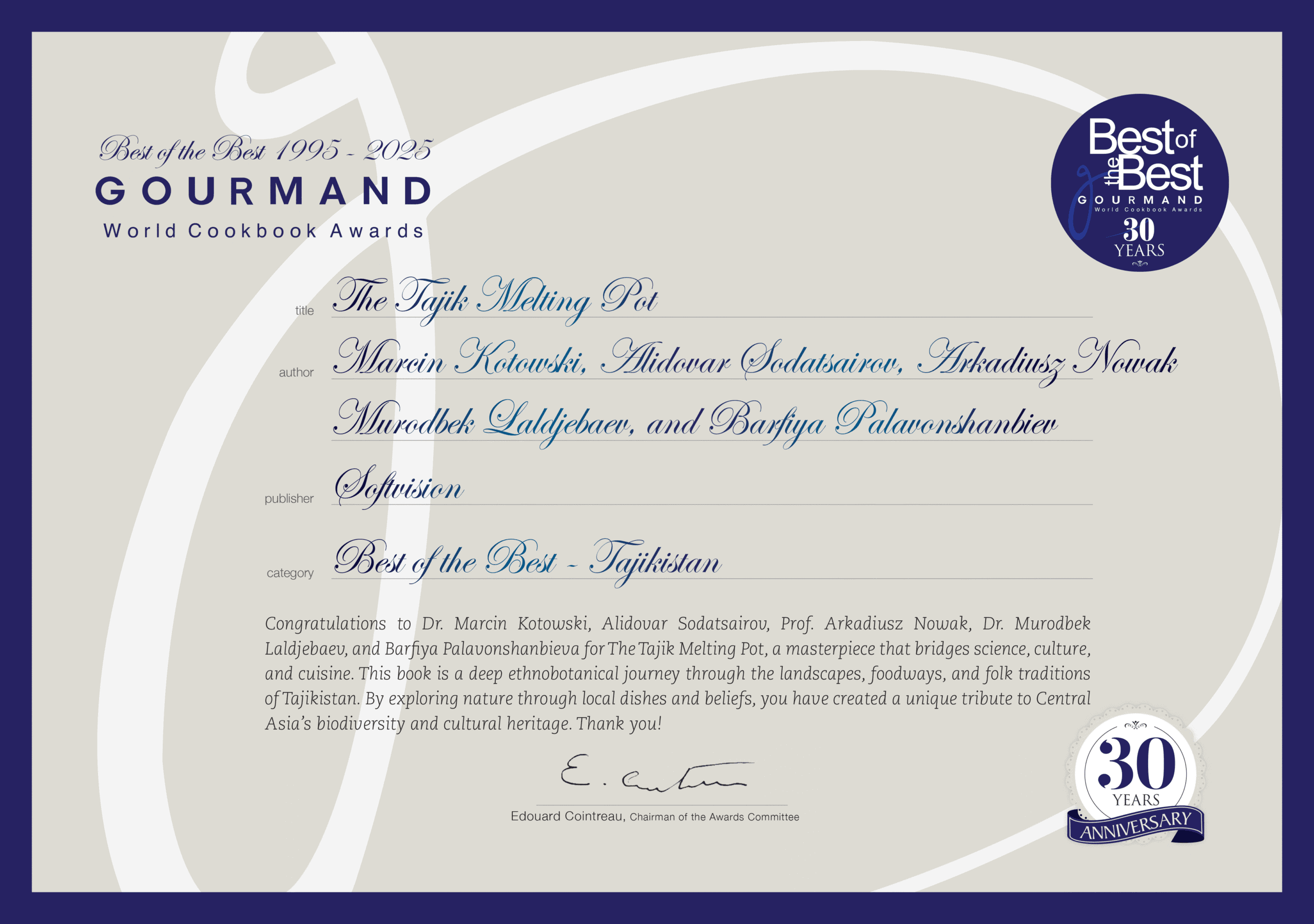 Z dumą informujemy, że książka „Tadżycki Tygiel” („Tajik Melting Pot – Reflections of Middle Asian Nature in the Culinary Culture of Tajikistan”), autorstwa Marcina Kotowskiego, Alidovara Sodatsairova, Arkadiusza Nowaka, Murodbeka Laldjebaeva i Barfiyi Palavonshanbiev, zdobyła prestiżowy tytuł BEST OF THE BEST TAJIKISTAN w międzynarodowym konkursie Gourmand World Cookbook Awards! Publikacja została wyróżniona podczas ceremonii w Rijadzie (Arabia Saudyjska) w ramach Saudi Feast Food Festival. Nagrodę wręczył Edouard Cointreau, założyciel Gourmand Awards, podkreślając jej wyjątkową wartość naukową i kulturową.