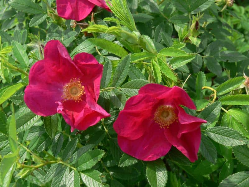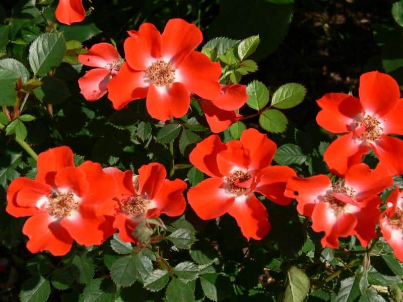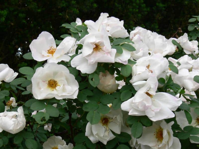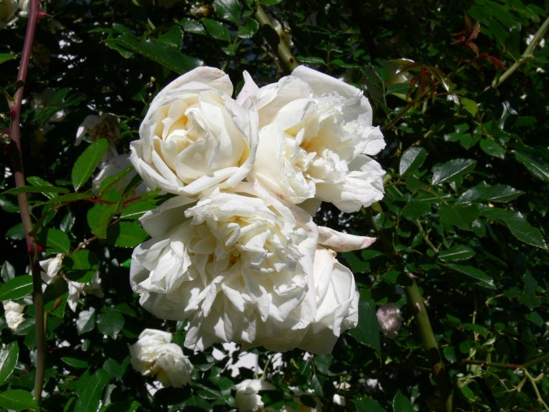 Park roses represent a diverse collection: species and their varieties, many historical roses, and varieties developed today. Their decoration is not only flowers, but also stems, thorns, fruits and leaves that colorfully discolor in autumn. So they are attractive not only during flowering. The first flowers in this group of roses appear already from the beginning of May, the last - before frost. Flowering is single or repeated. The collection includes varieties of R. glauca, R. beggeriana, R. foetida, R. rugosa, R. moyesii, R. spinosissima (R. pimpinellifolia), R. ×rugotida and others. Of note is Rosa sericea subsp. omeiensis f. pteracantha, a four-petaled rose which, as the name suggests, has four petal perianths, while other wild rose species have five. It often blooms as early as the end of April. Its main ornamentation is its huge, wide thorns, on young shoots bright red shining through in the sunlight. The Moyes rose (R. moyesii) 'Nevada' and 'Marguerite Hilling' with huge flowers are also outstanding, as well as varieties of the thick-spiked rose (R. spinosissima): 'Maigold', 'Frühlingsgold', 'Frühlingsmorgen', 'Frühlingsduft', 'Aïcha', 'Hispida' due to the extraordinary abundance of flowers appearing already in May and early June. All summer until late autumn bloom varieties derived from the wrinkled rose (R. rugosa) - 'Pierette', 'Hansa', 'F.J. Grootendorst' and others. In autumn, many park roses are decorated with multicolored fruits, colorful leaves, for example, Dutch rose (R. ×rugotida) 'Dart's Defender', 'Hurdal', 'Semiplena' and glossy rose (R. nitida) with red stems.