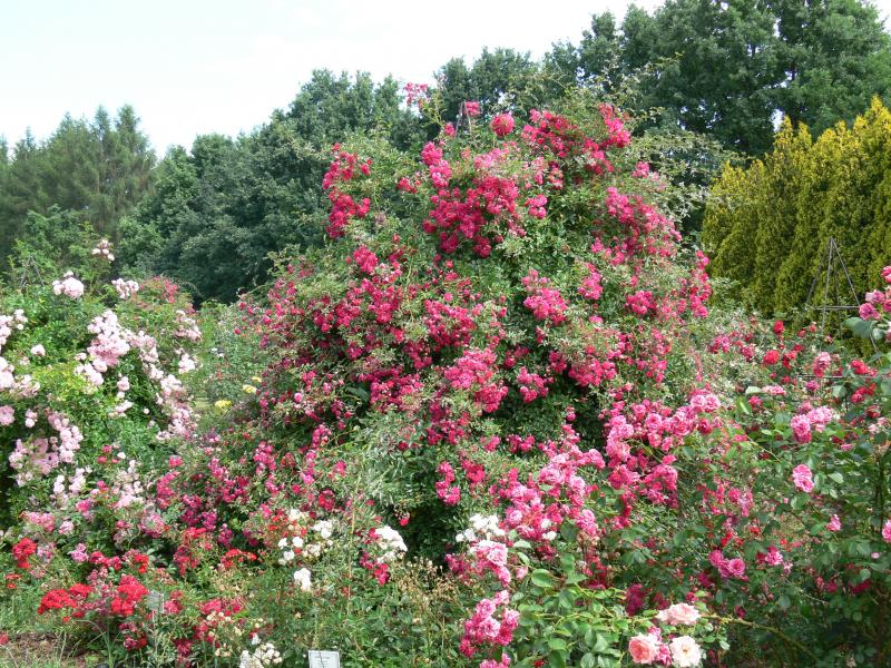 National Collection of Cultivated Varieties of Roses. includes several sections located in different areas of the Botanical Garden. The presented species and varieties show the diversity of cultivated roses, from those known thousands of years ago to the latest novelties of breeders from all over the world. The presented roses are representatives of all distinguished groups in terms of cultivation (park roses, climbing roses, large-flowered roses, bedding roses, groundcover roses, miniature roses) and almost all groups in terms of origin (Bourbon, remontant, Noisetta, tea hybrids, etc.). Also collected are those that were significant in the history of rose breeding and Polish breeding. The progress of breeding means that at least dozens of new varieties are introduced to the market every year. Shrubs, due to the great diversity of the genus, are planted in non-uniform combinations taking into account not only their origin and belonging to particular groups, but also color, flower shape, breeder, growth character and other features of importance mainly for later practical use. The collection is attractive from spring (shoots, spikes, first flowers from early May) to late autumn and early winter (fruits, shoots, spikes, discolored leaves, last flowers and buds).
