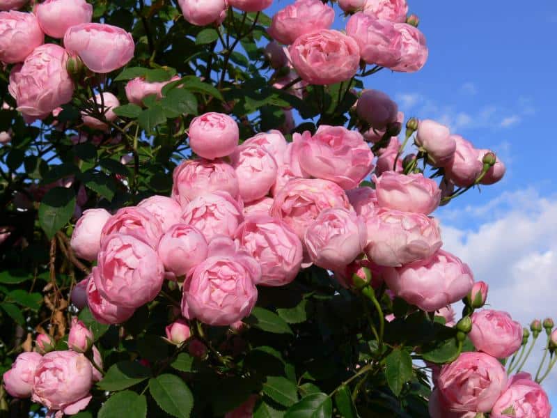 Clinging roses, botanically are primitive vines, without specialized clinging organs, , "clinging" to supports with thorns, present a crop of diverse origins. Older varieties can be divided into two groups - rambler and climber. Climbing roses climber, are mostly derived from Wichury rose (R. wichurana), Kordes rose (R. ×kordesii), sometimes they are sports of tea hybrids, while climbing roses rambler - mainly from multiflora rose (R. multiflora). Noteworthy is 'Veilchenblau' for its rare violet color of petals in a lovely heart shape. One of the older climbing varieties, at the same time with the darkest black-purple flowers is 'Guinée' (1938). Noteworthy is 'Ena Harkness clg', with very large scarlet flowers. The pale pink 'New Dawn' (1930) is the first climbing variety to repeat flowering and the first plant protected by a US patent. Many valuable climbing varieties carry its genes, e.g. 'Morning Dawn', 'Aloha', 'White Dawn', 'Coral Dawn', 'Schoolgirl'. Beautiful, fragrant, dark orange-pink, very full, quarter-set flowers have R. rubiginosa 'Alchymist'. Valuable varieties are the very abundant flowering and strong growing 'Kew Rambler' (1912) and 'American Pillar' (1902). Spherical flowers, full of charm, appear in R. macrantha 'Raubritter' (1936). The collection also grows newer varieties, e.g. Super Dorothy, Super Excelsa, Perennial Blue - ramblers that repeat flowering; Elfe - with celadon flowers; Schneewalzer - with huge white-cream, noble-shaped flowers; Uetersener Klosterrose - with full cream-pink flowers; reminiscent of old roses.