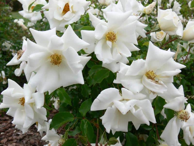 An important part of the collection is a collection of ground-cover roses, intended for areas with extensive growing conditions and for so-called difficult areas. They were separated as a group only in the 1970s, for which new uses were found. This group includes varieties already known and existing, as well as new ones bred specifically for this purpose. Many rose species also belong here. Nowadays, some of them are part of a new trend in breeding and, more recently, a new group in terms of use - landscape roses (Landscape Roses). They are characterized by abundant, long flowering, high resistance to frost, heat, disease and pests, and do not require much maintenance. Most of them bloom from June until frost. There are, among others, varieties bred in Meilland's nurseries, e.g. white Alba Meidiland, pink Bingo Meidiland; W. Kordes' Söhne, e.g. pink-red Tommelise, red Mainaufeuer; Noack's, e.g. pink Heidetraum; Poulsen Ap/S Roses - Towne & Country varieties. There are also many varieties here derived from species e.g. R. rugosa - intended for urban conditions Pavement®, R. ×mariae-graebnerae 'Rote Hannover', R. spinosissima 'Repens'.