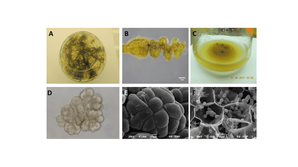 Steps leading to the derivation of liquid culture Cyathea smithii: (A) obtaining sterile in vitro culture of plants on agar medium (view of root system as viewed from the bottom of the jar); (B) root fragment with visible callus tissue used to initiate suspension cultures; (C) liquid culture of callus tissue cells; (D) suspension cells - light microscope image; (E) suspension cells - scanning electron microscope image; (F) cells C. smithii As an object of experimentation - the visible interior of the cells.
